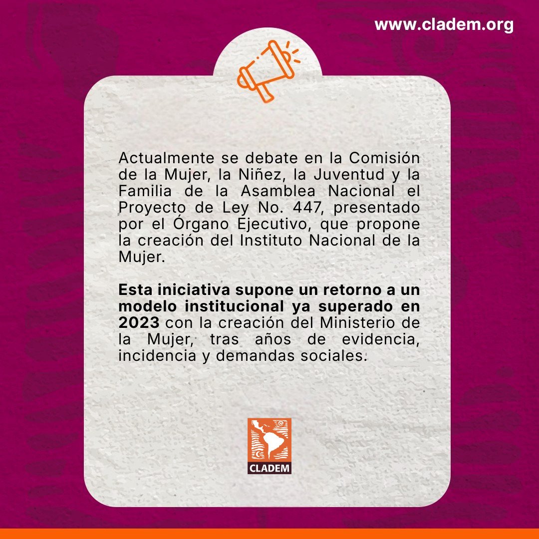 CLADEM es una red regional presente en 15 países de América Latina y el Caribe, y en este caso explica que la iniciativa para desaparecer el Ministerio de la Mujer se debate en la Comisión de la Mujer, la Niñez, la Juventud y la Familia de la Asamblea Nacional el Proyecto de Ley No. 447, presentado por el Órgano Ejecutivo, que propone la creación del Instituto Nacional de la Mujer.