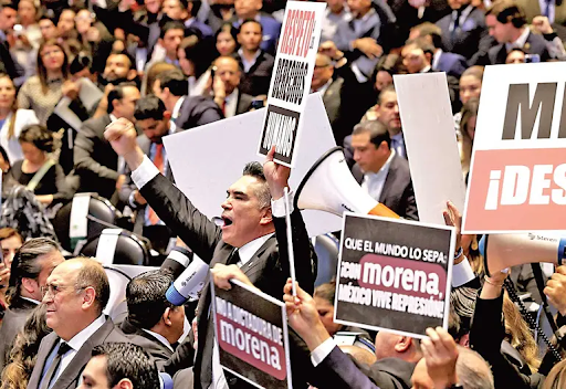 Mientras los priistas pararon la sesión con altavoces y sirenas, los posicionamientos de los opositores fueron acallados por legisladores de la Cuarta Transformación