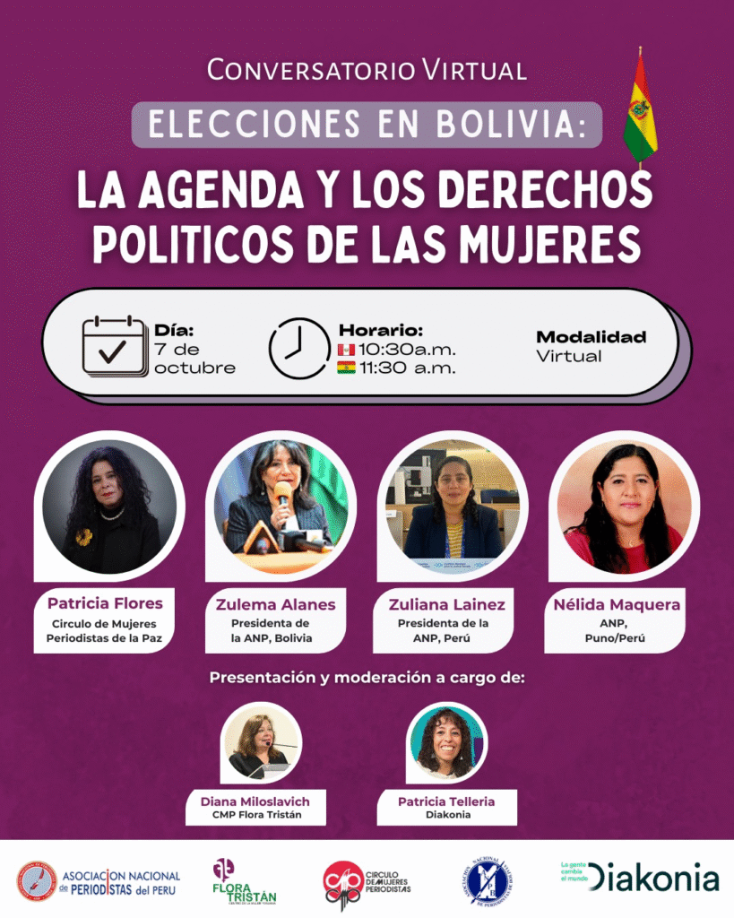 En el conversatorio organizado por el Centro de la Mujer Peruana “Flora Tristán” y Diakonia Perú, presididas por Diana Miloslavich y Patricia Tellería, respectivamente, participaron la feminista y comunicadora Patricia Flores Palacios, delCírculo de Mujeres Periodistas por la Paz, y Zulema Alanes, presidenta de la Asociación Nacional de Periodistas de Bolivia (ANPB).