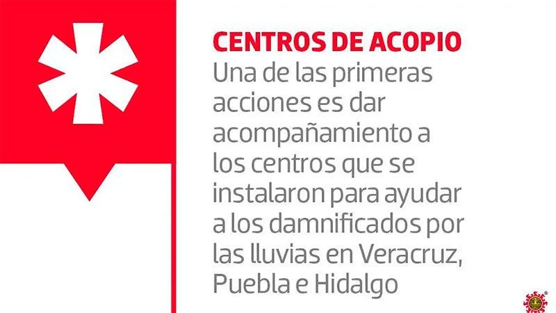 Informó que una de las primeras acciones que ya está en marcha es dar acompañamiento en los centros de acopio que se instalaron para ayudar a los damnificados por las lluvias en Veracruz, Puebla e Hidalgo.