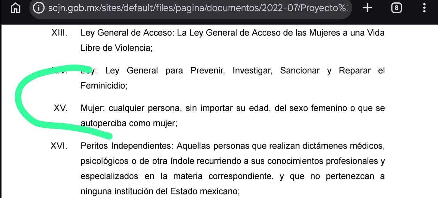 Sin embargo, señalan que la Suprema Corte de Justicia de la Nación propone definir «mujer» como «cualquier persona del sexo femenino o que se autoperciba como mujer».