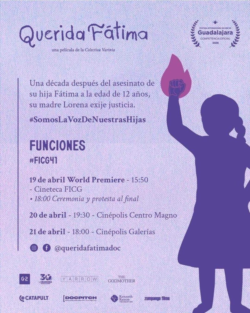 Querida Fátima —una película de la Colectiva Varinia en competencia oficial del Festival Internacional de Cine en Guadalajara (FICG41), narra la historia de Lorena, madre que exige justicia una década después del asesinato de su hija Fátima, de 12 años.  En la proyección del domingo se dio a conocer la situación de los apoyos, y se hizo un pase de lista de las víctimas de feminicidio.