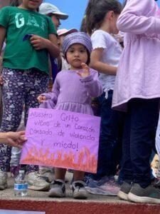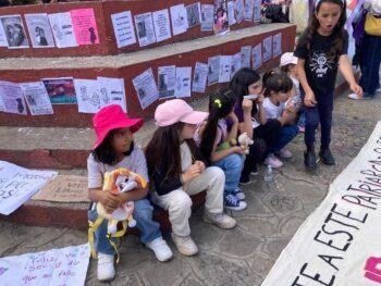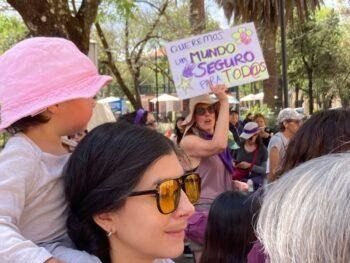 En seguida venía el contingente de las niñeces, sosteniendo mantas o pequeñas pancartas. Seguían las tamboreras, la guardia de seguridad y la mezcla de mujeres de todas las edades, colores y orígenes. Coreamos las consignas mientras que algunos transeúntes se mostraban indiferentes pero otros también se nos sumaban. La marcha tiñó de morado al “pueblo mágico” también objeto de denuncia por feminicida.