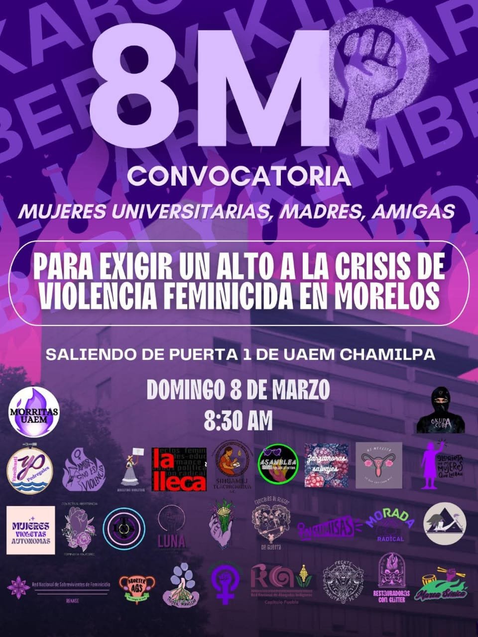 La cita es este domingo en la Puerta 1del Campus Chamilpa, UAEM a partir de las 8:30 de la mañana. La ruta de la marcha que inicia en Chamilpa hasta Tlaltenango, donde nos uniremos al contingente general del 8M en Cuernavaca para llegar a Plaza de Armas.