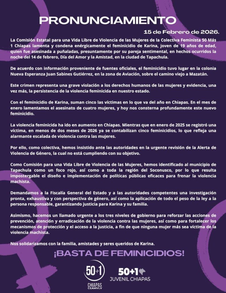 Este crimen se suma a una cifra alarmante de violencia contra las mujeres en Chiapas, ya que en lo que va de 2026 se han registrado cinco feminicidios, mientras que en el mismo periodo del año pasado solo se contabilizó uno, lo que refleja un incremento significativo de este delito en la entidad, manifestó en un pronunciamiento la Colectiva feminista 50 más 1.
