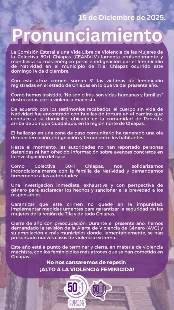 Con este crimen de Natividad, la cifra oficial de víctimas de feminicidio en el estado de Chiapas asciende a 31 en lo que va del presente año, una estadística que, de acuerdo con la Colectiva, subraya la crisis de violencia machista.