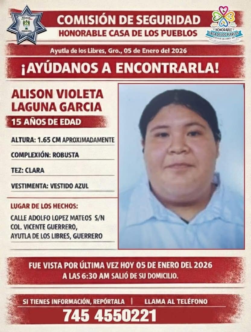 5 de enero, Ayutla de los Libres, Alerta de búsqueda por Alysson Violeta Lagunas García de 15 años de edad.