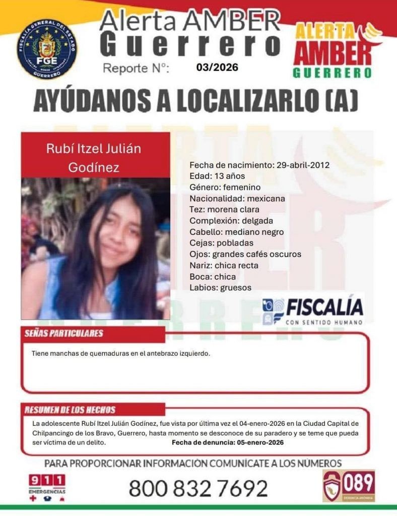 3 de enero, Chilpancingo, Alerta de búsqueda por Rubí Itzel Julián Godínez, de 13 años de edad.