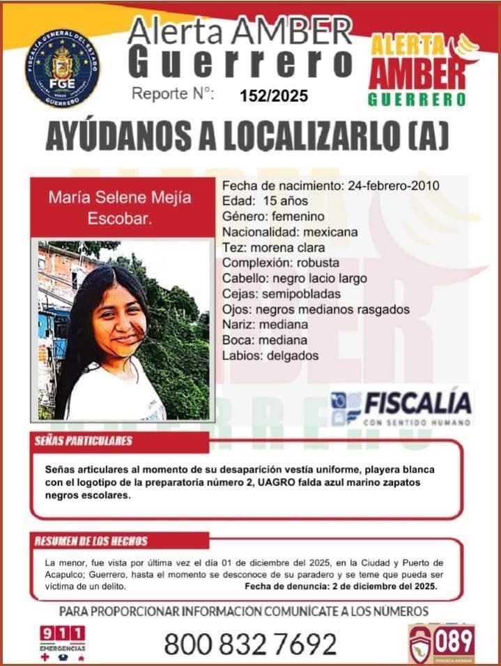 4 de enero, Acapulco, Alerta de búsqueda por María Selene Mejía Escobar, de 15 años de edad.