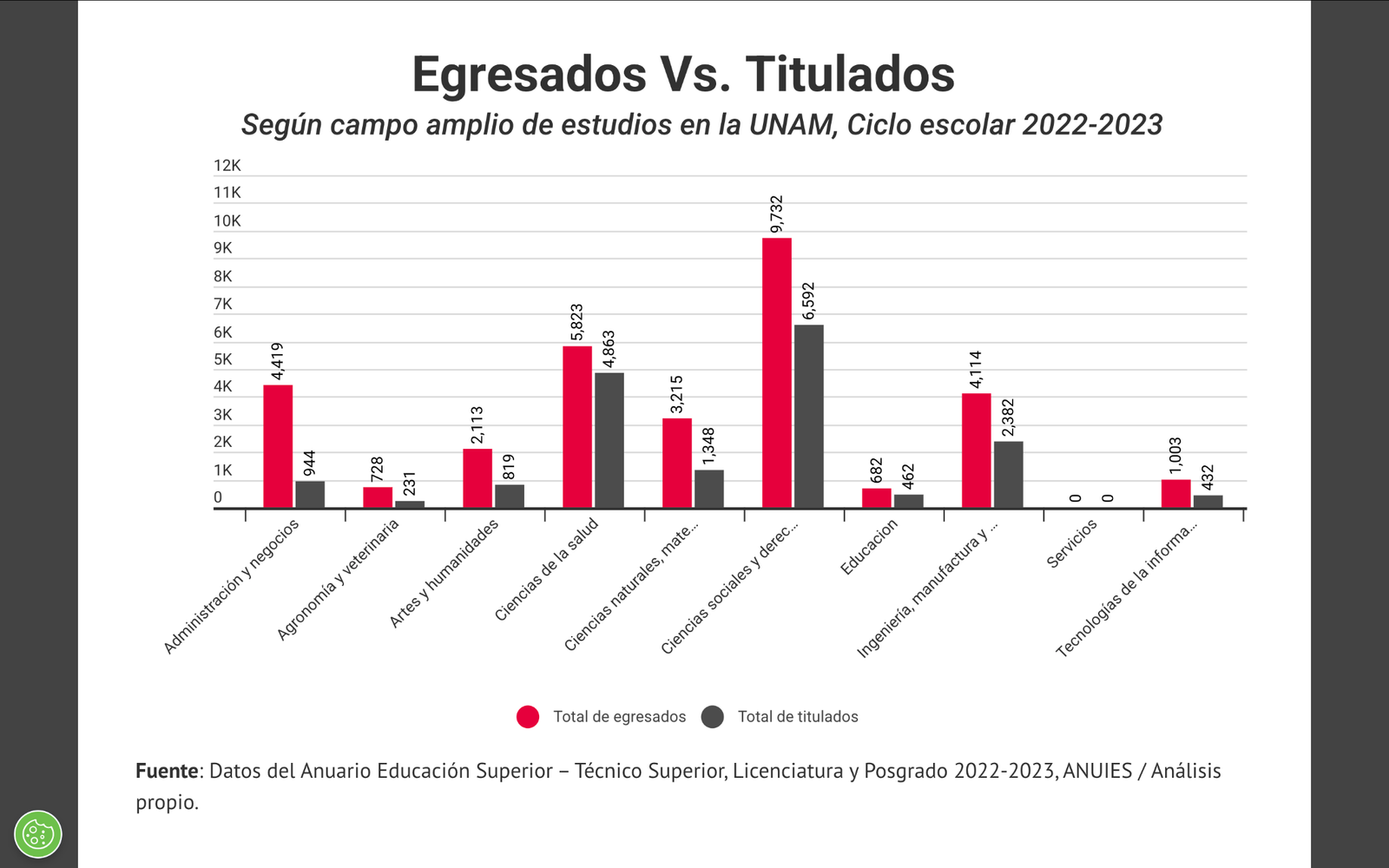 En la siguiente gráfica, con datos de ANUIES, se aprecia la disparidad entre personas egresadas y personas tituladas en la UNAM, en el ciclo 2022-2023. Dichos datos son congruentes con otras fuentes que indican que sólo un 30 % del estudiantado que termina una licenciatura, logra titularse dentro del tiempo esperado o en absoluto. De acuerdo con la clasificación de ANUIES, en 2022 las carreras con más títulos en la UNAM fueron Derecho (13.3%), Médico Cirujano (12.6 %), Cirujano Dentista (6.92%), Enfermería (6.32%) y Psicología (6.72%), pues para ejercer estas carreras es indispensable contar con una cédula profesional.