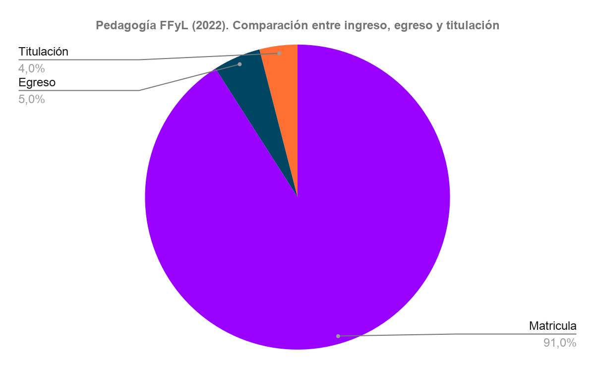 La matrícula de ingreso a la carrera de Pedagogía en la FFyL de la UNAM se ha mantenido, en los últimos años, en un promedio de entre 3 mil y 3,500 estudiantes, con una titulación de alrededor del 4.42% anual, lo que claramente expresa un efecto coladera entre la matrícula de ingreso y las personas que se titulan. En 2022, se matricularon 3,077 personas, egresaron 170 (5%)y se titularon 136 (4%), como se aprecia en el gráfico circular que aparece abajo.