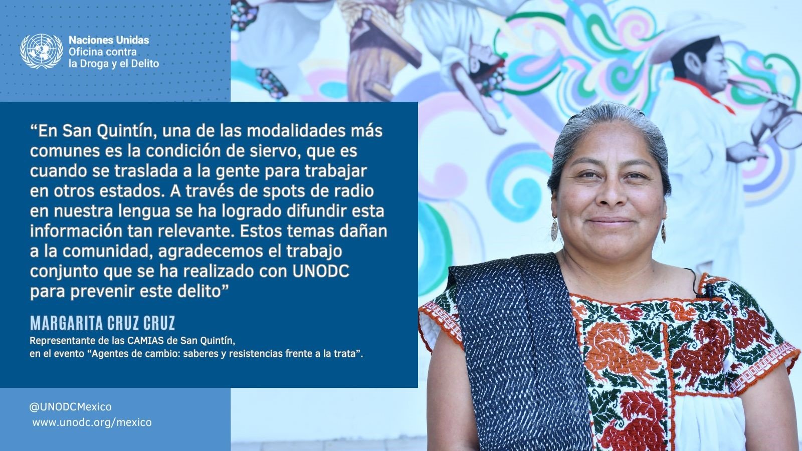 “En San Quintín, una de las modalidades más comunes es la condición de siervo, que es cuando se traslada a la gente para trabajar en otros estados. A través de spots de radio en nuestra lengua se ha logrado difundir esta información tan relevante. Estos temas dañan a la comunidad, agradecemos el trabajo conjunto que se ha realizado con UNODC para prevenir este delito”, dijo Margarita Amalia Cruz Cruz.