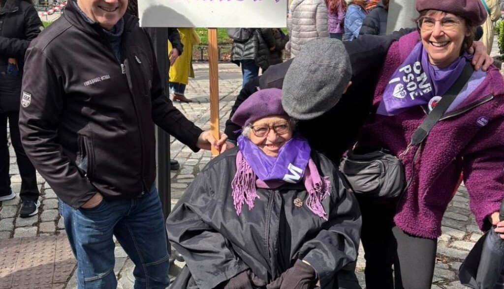 Y de las más jóvenes, a las más mayores, como Lola que, a punto de cumplir en mayo 100 años, no ha dudado en acudir al centro de Madrid con su gorro y bufanda morados, portando una pancarta en la que se podía leer «100 años, 100% feminista».