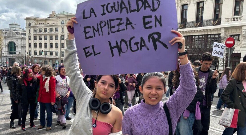 Dos jóvenes en el 8M con la pancarta «la igualdad empieza en el hogar» M.M