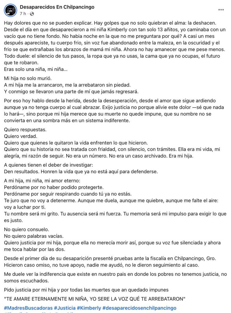 La página “Desaparecidos en Chilpancingo” reproduce este sentir de la mamá de la menor que fue encontrada sin vida en el cerro del Huiteco.