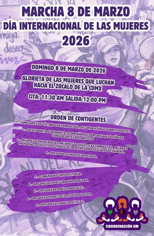 SemMéxico, Ciudad de México, 2 de marzo, 2026.- La Coordinación 8M 2019 anunció la realización de la marcha del próximo domingo 8 de marzo, en el marco del Día Internacional de las Mujeres, que partirá de la Glorieta de las Mujeres que Luchan con destino al Zócalo de la Ciudad de México. Es la principal marcha en la que participan las principales colectivas y organizaciones que luchan por el aborto libre, alto a la violencia feminicida y los derechos humanos de las mujeres.