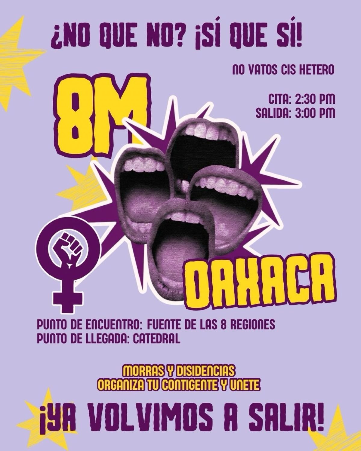 La cita el 8 de marzo, en la fuente de la 8 Regiones, espacio que alberga La Monumenta en la ciudad de Oaxaca de Juárez, a las 2.30 de la tarde, para media hora después iniciar la marcha rumbo a la explanada de la Catedral ubicada en el Centro Histórico.