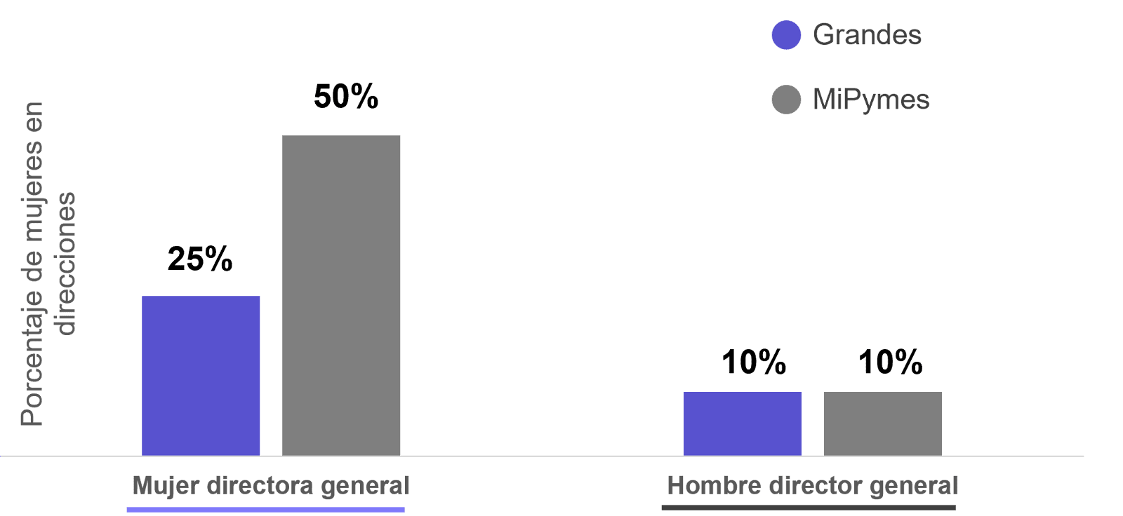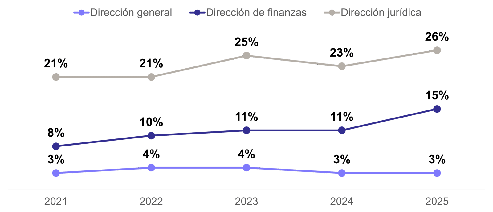 - Las mujeres representan 3% de las direcciones generales, 15% de las financieras y 26% de las jurídicas.