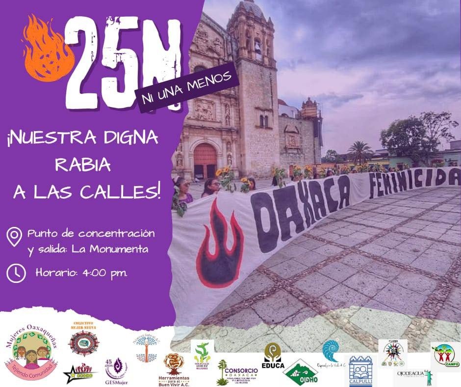 Consorcio Oaxaca ¡Ni una más! Marcha 25 N (Transincluyente). La convocatorio es a todas las mujeres diversas, colectivas, organizaciones, defensoras y activistas a tomar la calles poque  el gobierno de Salomón Jara sigue sin llegar a las mujeres, las niñas, y personas trans que todos los días están en riesgo quedando evidenciada la incapacidad e indiferencia ante los feminicidios, desapariciones y agresiones. La cita es a las 4 de la tarde en la Monumenta en la Ciudad de Oaxaca.
