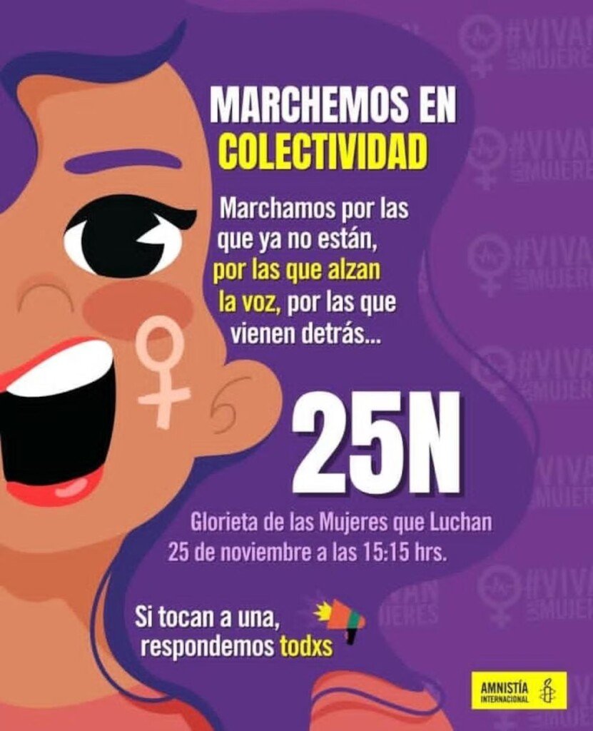 Amnistía Internacional (AI), la organización defensora de los derechos humanos más grande en el mundo convoca a marchar en colectividad, “por las que ya no están, por las que alzan la voz que vienen detrás. El punto de reunión La Glorieta de las Mujeres que lucha a las 3 de la tarde.