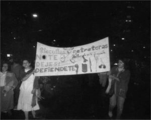 8.- A mi regreso a México a principios de los 80, Ana Victoria se integró al taller de arte feminista que impartí en la Academia de San Carlos. Ahí también conocí a Karen Cordero. A partir de este taller surge el grupo Tlacuilas y Retrateras más o menos en las mismas fechas que Polvo de Galllina Negra. Es más, la primera salida pública de ambos grupos es durante una manifestación feminista en 1983.