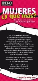 14.Como en 2009, 2010, Ana Victoria nos platicó a Karen y a mí que había tratado de donar su archivo al entonces CIEG de la UNAM y a estudios del a mujer de la UAM y que no lo habían querido. Entonces formamos un grupo que se llamó Mémora, con Deborah Dorotinsky, Julia Antivilo, Paz Sastré y no me acuerdo quién más y empezamos a trazar diversas estrategias para que acabara en buen lugar. Recuerdo una conferencia que dimos AVJ, Karen y yo llamada LOS ARCHIVOS DE GÉNERO, ARTE Y MILITANCIA EN MÉXICO: REALIDADES Y UTOPÍAS, el 8 de marzo de 2010 en el Centro Cultural España. A través de Mémora y de la insistencia de Karen, se logró que quedara en la Biblioteca Francisco Clavigero de la Universidad Iberoamericana. Para marcar la donación, organizamos una exposición llamada Mujeres ¿y qué más?, curada por las alumnas de Karen, con obra de las participantes en mi Taller de Arte y Género, toda en torno a los materiales en el archivo de Ana Victoria. Por cierto, el archivo recién acaba de ser nombrado Memoria Documental de México, dentro del programa Memoria del Mundo de la UNESCO.