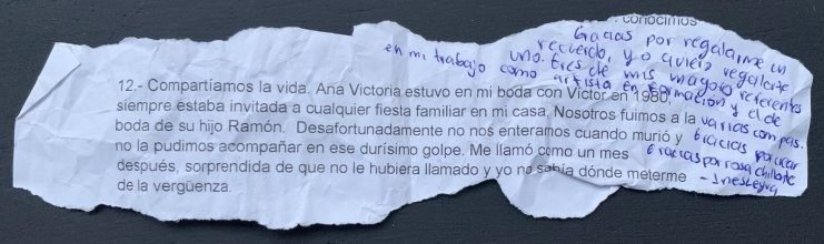 Al terminar el recorrido, y después de responder preguntas, algunas personas que habían recogido los pedacitos de papel se acercaron a mi para que se los firmara. Sin embargo, una joven escribió uno de sus propios recuerdos y me lo regaló.