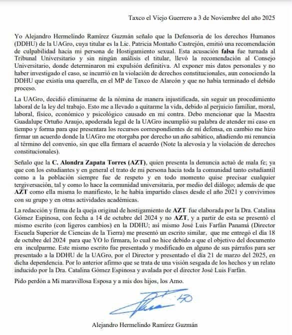 SemMéxico/Ceprovysa, Chilpancingo, Guerrero,  7 de noviembre, 2025.- El profesor Alejandro “N” quien fue expulsado como trabajador de la Universidad Autónoma de Guerrero luego de acusaciones de hostigamiento sexual en la Escuela Superior de Ciencias de la Tierra, se quitó la vida y dejó una carta póstuma en la que confirma que lo hace debido a lo que él llamó falsas acusaciones promovidas por la defensoría de Derechos Humanos que no realizó una verdadera investigación en torno a la supuesta acusación.