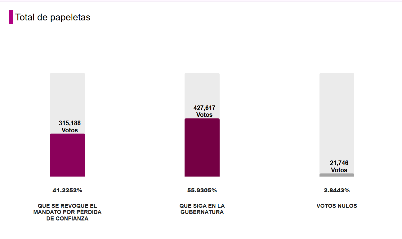 En suma, de acuerdo con los datos que dio a conocer el gobernador, sólo el 9.2 por ciento del total de la Lista Nominal -a las 10 de la noche- habrían votado por la continuidad de su mandato, pese a ello, sostuvo que está convencido de que la autoridad solo es legítima cuando nace y cuenta con el respaldo de la voluntad popular y mantiene el “apoyo y la confianza ciudadana después de tres años de gestión”.