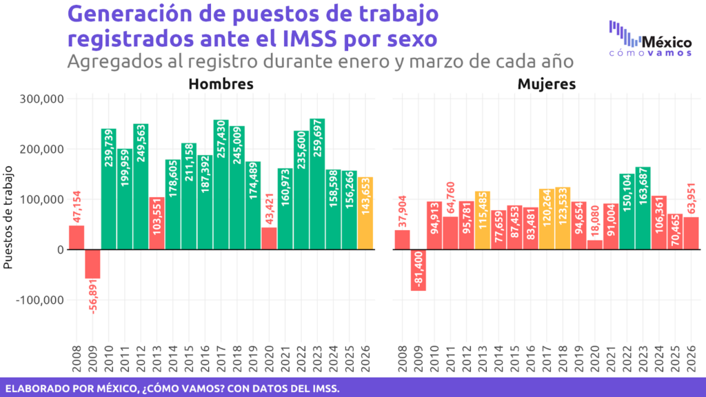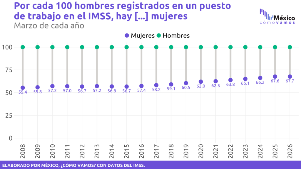 A pesar de que la diferencia de puestos registrados en el IMSS entre mujeres y hombres ha disminuido con el tiempo, a marzo de 2026 persiste una brecha notable: por cada 100 hombres registrados únicamente hay 68 mujeres.