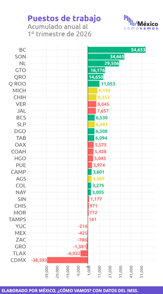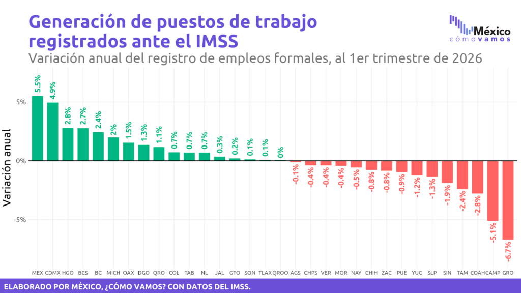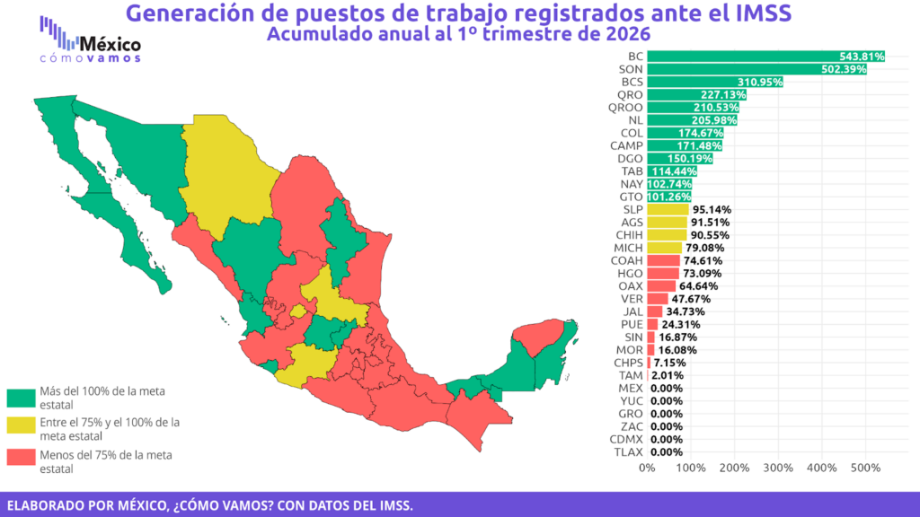 Al primer trimestre de 2026, un total de 12 entidades cumplieron con su meta de generación de empleo formal establecida por MCV (acumulados en el año). Las entidades con mejor desempeño fueron Baja California, Sonora y Baja California Sur. En contraste, seis entidades perdieron puestos de trabajo en el primer trimestre de 2026. Aquellas con las mayores caídas fueron Ciudad de México, Tlaxcala y Guerrero.