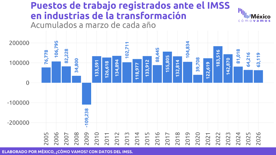 A marzo de 2026 se registraron 63 mil 119 puestos de trabajo en el registro ante el IMSS en las industrias de la transformación, el acumulado más bajo para un primer trimestre desde el año 2020.