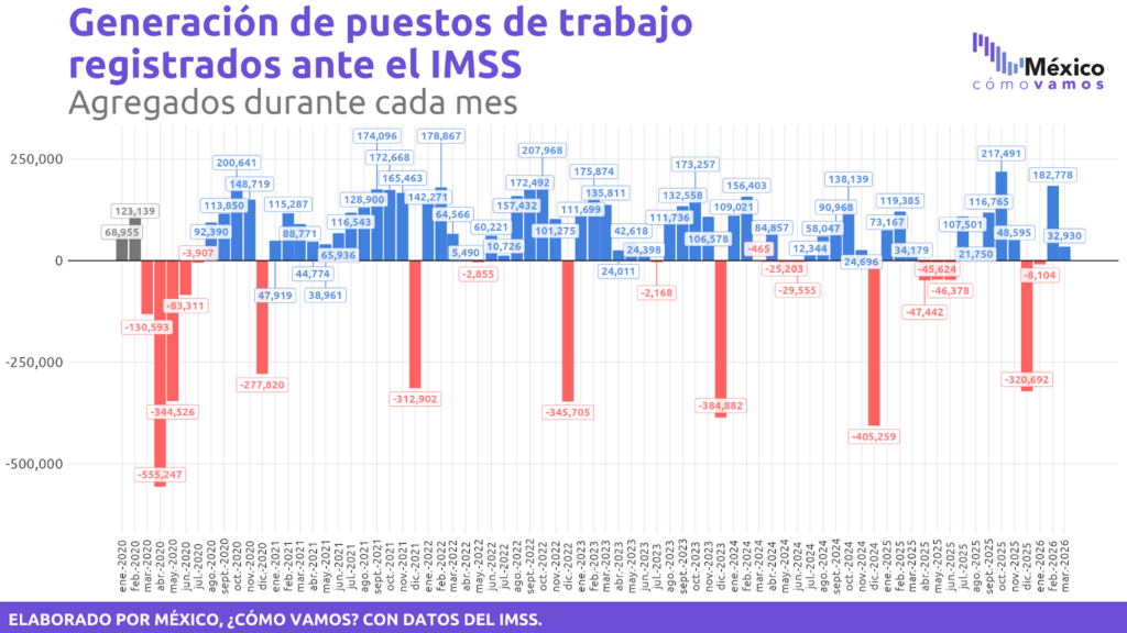 Durante enero se registró una reducción de (-)8 mil 104 puestos asegurados ante el IMSS, el inicio de año más bajo desde 2009. El aumento más significativo fue en febrero, con 182 mil 778 puestos formales generados. En contraste, durante marzo se tuvo un aumento menos significativo, con 32 mil 930 puestos registrados.