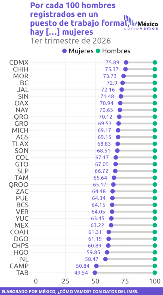 Esta brecha es heterogénea entre los estados: en CDMX, la brecha en la generación de puestos formales es menor, con 76 mujeres con un puesto de trabajo registrado en el IMSS por cada 100 hombres.