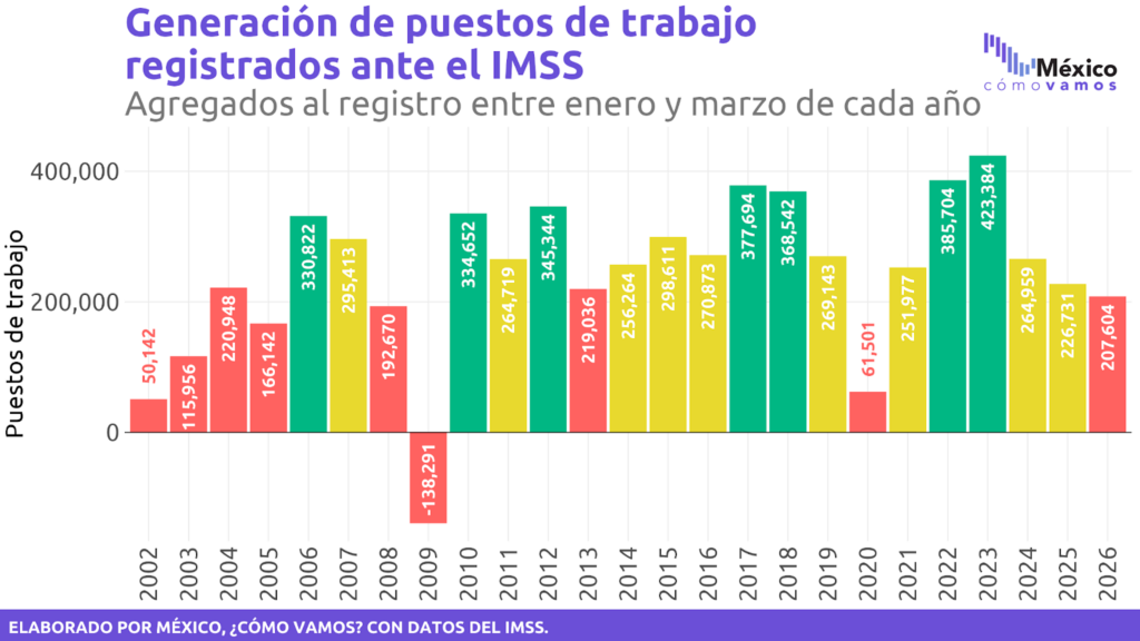 Al primer trimestre de 2026 se crearon 207 mil 604 puestos de trabajo, el acumulado más bajo para un primer trimestre desde el 2005, excluyendo años de crisis como la Gran Crisis Financiera (2008–2009) y la pandemia de COVID-19 (2020).