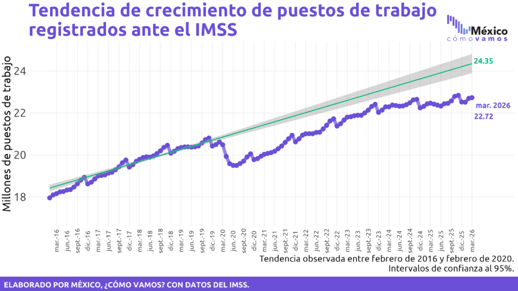 En México, ¿cómo vamos? damos seguimiento mensual a esta cifra, ya que el número de puestos registrados ante el IMSS es el indicador más oportuno disponible y representa más del 80 % del empleo formal en el país; por ello, lo utilizamos como base para nuestro Semáforo de empleo formal. Medir esta meta a través de la tasa de desocupación (2.7%, ENOE febrero 2026) puede llevar a interpretaciones equivocadas, ya que una baja en la tasa no necesariamente implica mayor empleo formal, sino que puede reflejar un aumento en el empleo informal, con menores ingresos y sin acceso a seguridad social.